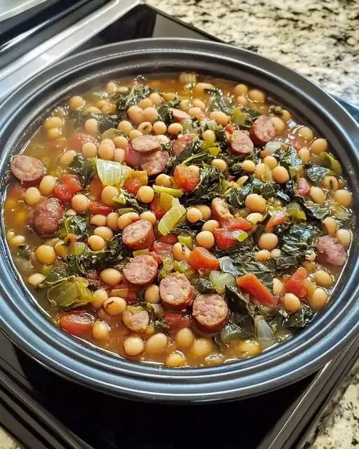 This isn’t just soup. It’s thick, hearty, and packed with flavor. The black-eyed peas get creamy, the sausage adds all that savory goodness, and the collard greens bring everything together. The whole thing simmers in the crockpot overnight, so you wake up on New Year’s Day to a house that smells incredible and a meal that’s already done.